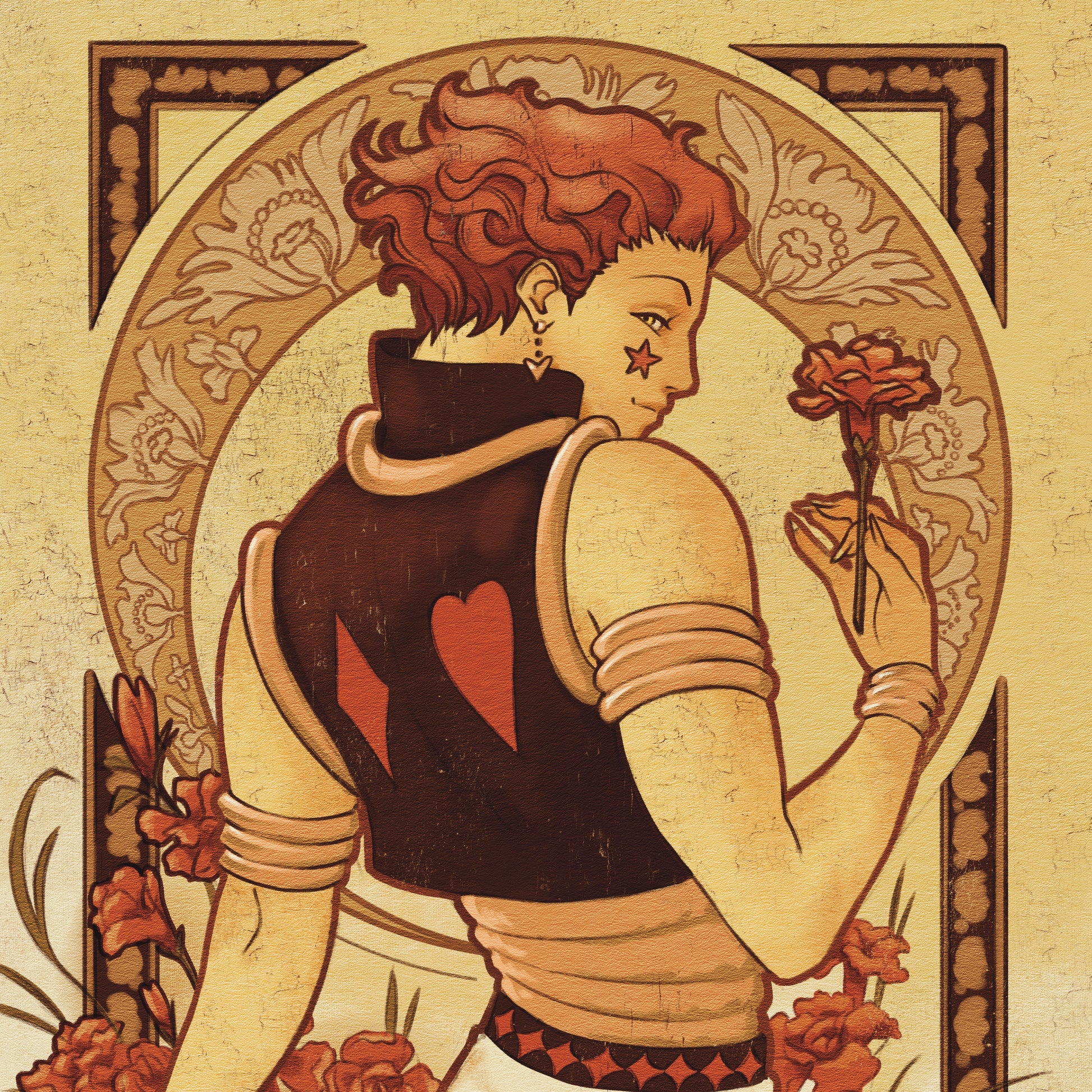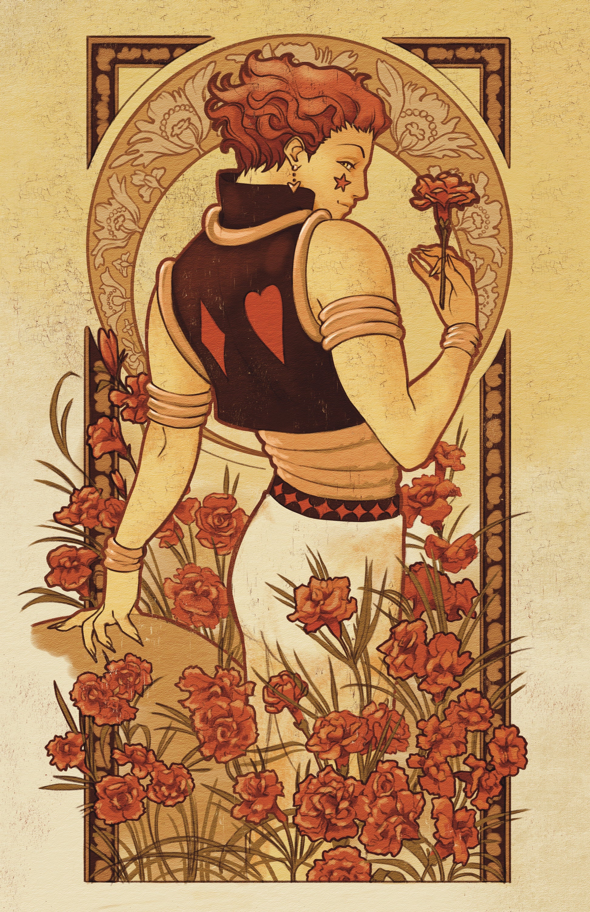 Poster-sized print of Hisoka with carnations in art nouveau style. Printed on heavy cardstock with a satin finish