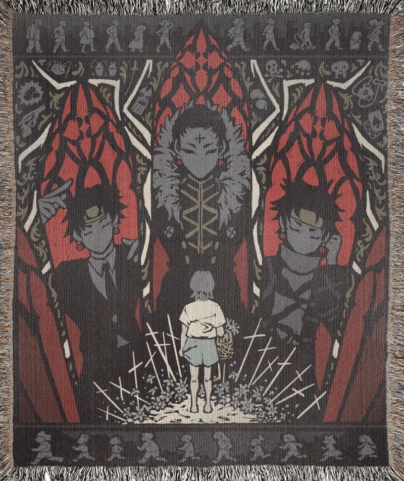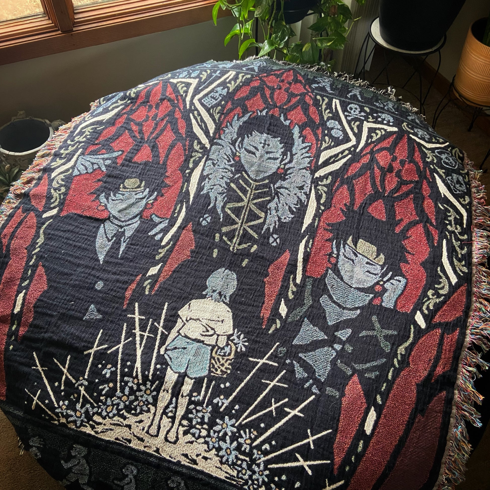 Woven blanket / tapestry, 50x60," 100% cotton, semi-soft. Shipping takes 2-3 weeks after purchase, depending on production time. Machine washable in cold.