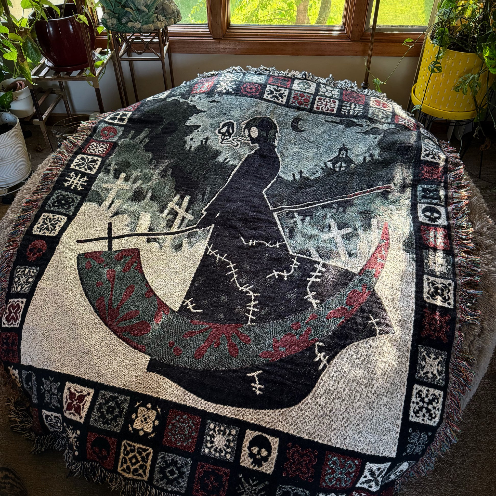 Woven blanket / tapestry, 50x60," 100% cotton, semi-soft. Shipping takes 2-3 weeks after purchase, depending on production time. Machine washable in cold.